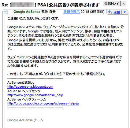 数日前からGoogle AdSenseが公共広告ばっかりだったので問い合わせた。