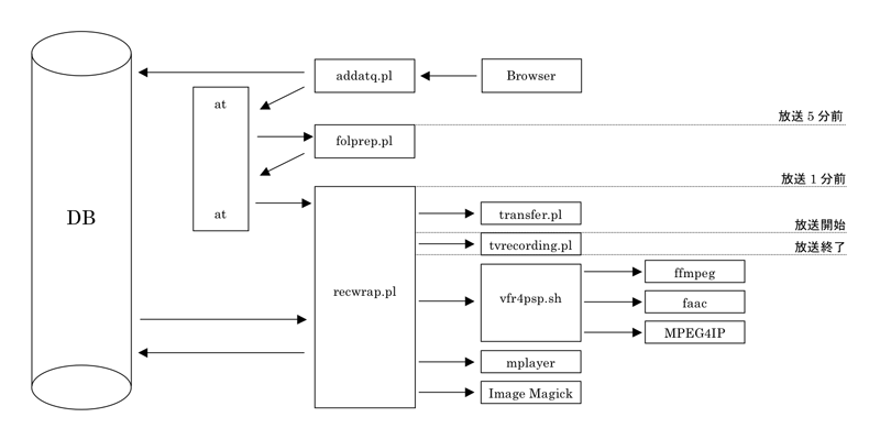 放送予定時刻の1分前になると録画の一連の流れを管理する録画プログラム[recwrap.pl]が起動します。このプログラムは、録画チャンネルが外部入力であれば外部チューナのチャンネルを適切なものに切り替えるためにリモコン送信プログラム[transfer.pl]を呼びだし、次に実際にビデオでバイスからファイルへの記録を行う録画プログラム[digitaltvrecording.pl]か[tvrecording.pl]を呼び出します。録画でバイスはPT1→friioの順で接続されていれば自動的に空きデバイスを探して録画します。デジタル録画出来るデバイスが不足した場合は利用可能なアナログ録画デバイスがあればそちらで録画を実行するように努力します。