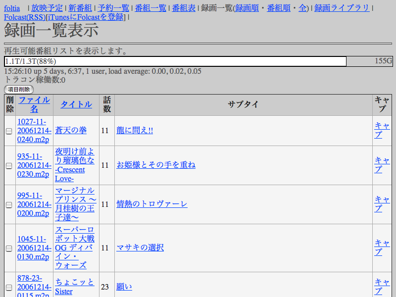 録画済みのMPEG2ファイルを放映順に一覧表示します。削除チェックボックスにチェックを入れて削除ボタンを押すとそのファイルは削除されます。上部にディスク空き容量とトラコンプロセスを表示します。