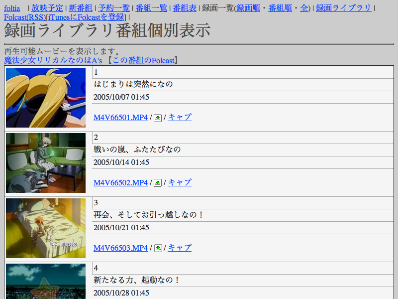 foltiaの内部データベースに登録されている全番組リストを表示します。MPEG4リンク項目は[録画ライブラリ]メニューと同じ詳細ページにジャンプします。